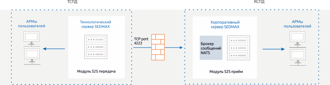 Укрупненно структура системы с разнесением технологического и корпоративного серверов и передачей по протоколу S2S выглядит следующим образом:
